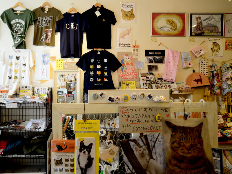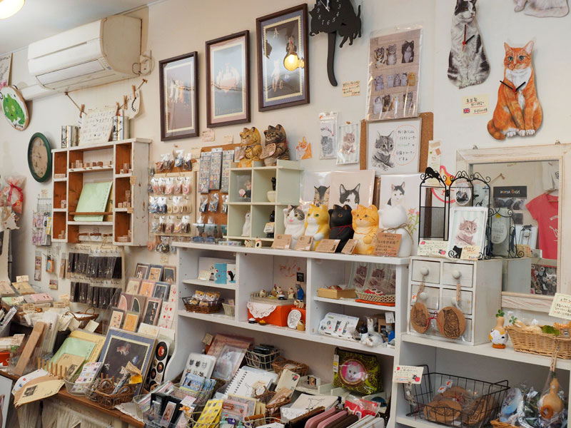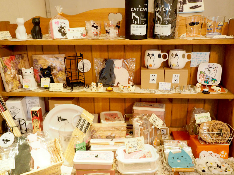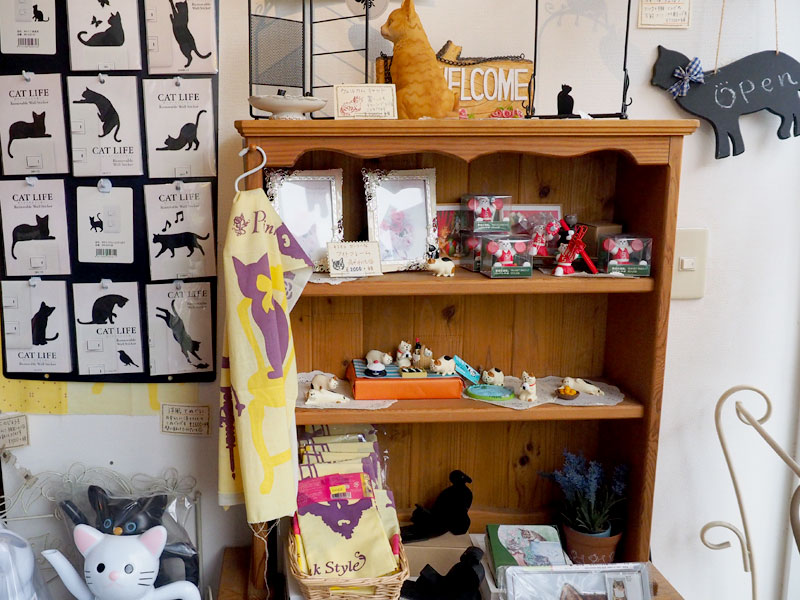 アンティーク風の棚に並んだたくさんのねこ雑貨